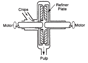 Figure shows the typical refiner used in the paper industry. The basic actions involved in the refiner are threshing. The basic configurations of the refiner are a large attrition mill with either two closely-spaced plates rotating in opposite directions or one plate rotating adjacent to a stationary plate.