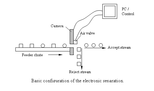 The basic idea about the electronic separation is using machine vision systems to identify the difference between the materials. Combine the electronic identification and material handling system give quick separation of these materials, especially the one cannot be separated using common pneumatic or other physical ways.